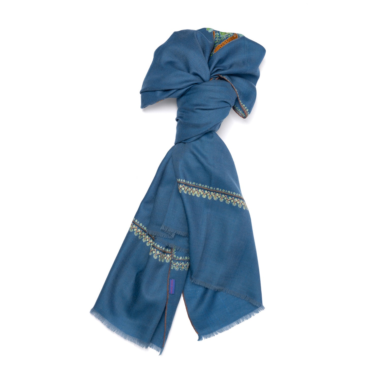 In historischer Tradition wird auf hölzernen Handwebstühlen gewoben und es wird von Hand bestickt. Das Weben obliegt in indischer Tradition den Frauen und die Männerhände besticken diese wundervollen Kunstwerke. Vom Auskämmen der Kaschmirwolle, bis zum fertigen Schal dauert es, ganz nach Größe, bis zu 9 Monate. Nach der Fertigstellung sticken die Handwerker ihre Initialen am Schalende ein und jeder Schal wird durch diesen gesamten Verlauf zu einem luxuriösen Unikat.